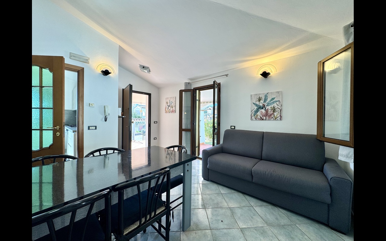 Appartamento Deluxe al piano strada con ampio giardino con zona relax e zona pranzo con barbecue all'aperto, soggiorno con divano letto, cucina separata, una camera da letto matrimoniale e un bagno.